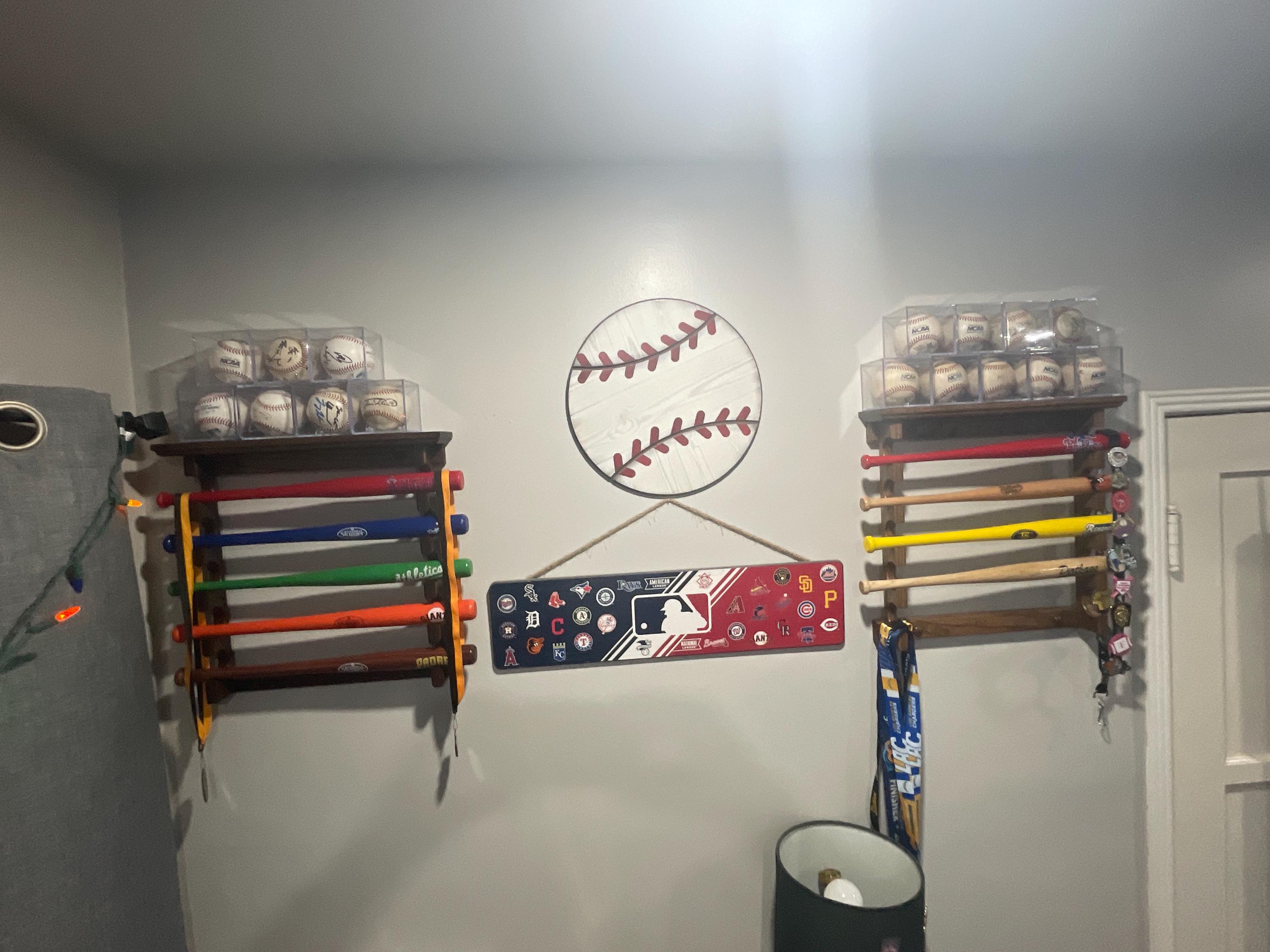Please allow time for production and for the finish to dry. Holds 5 ballpark souvenir mini bats and five regular sized baseballs. This bat rack is made of solid Ash Wood. The measurements are 17.5 by 18 inches. The shelf is 3.25 inches deep. Available in choice of finish. Hanging Hardware is included. I build these racks at the time the order is placed please allow for production time.